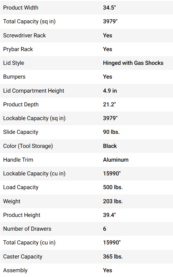 - 6 drawers: rows 1-3: 3" x 34.25" x 20" (H,W,D), rows 4-5: 4" x 34.25" x 20", row 6: 5" x 34.25" x 20" (H,W,D)